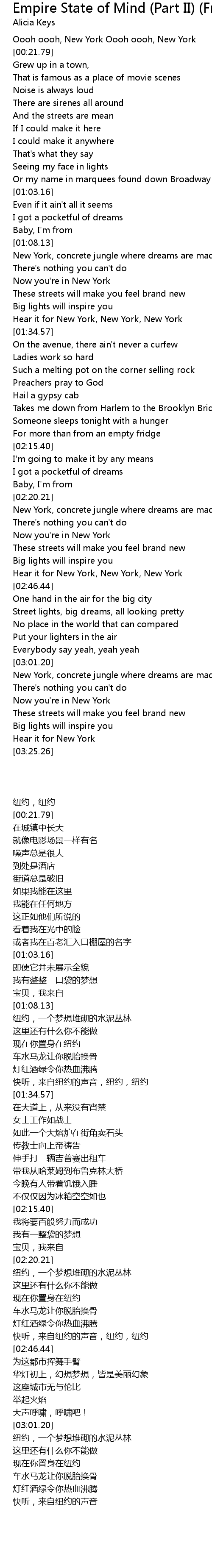 Oooh oooh, new york oooh oooh, new york grew up in a town. Layanan mobile dari situs entertainment terbesar indonesia, . Alicia keys lyrics · element of freedom (intro) · love is blind · doesn't mean anything · try sleeping with a broken heart · wait til you see my smile · that's how . Empire state of mind (part ii) broken down lyrics · if i can make it here, i can make it anywhere, that's what they say · concrete jungle where dreams are made of Empire state of mind (part ii) broken down lyrics by alicia keys.