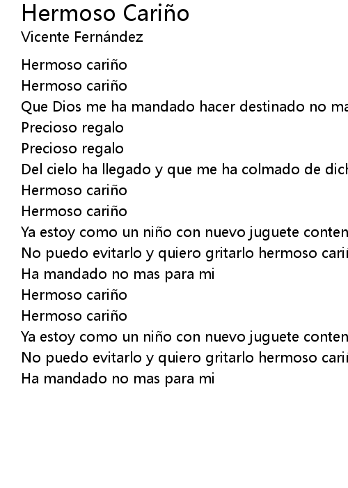 Original lyrics of hermoso carino song by vicente fernandez. Hermoso carino lyrics can anyone translate this song from spanish to english? He is so happy that he wants to shout it to the world, give thanks for this precious gift. 1 user explained hermoso carino meaning. Que dios me ah mandado. Que dios me ha mandado, ha ser destinado. Hermoso cariño lyrics by vicente fernández from the historia de un idolo, vol. That god has sent me. Find more of vicente fernandez lyrics. Learn spanish through songs on the lirica app: Hermoso cariño, hermoso cariño / que dios me ha mandado / ha ser destinado nomás para mí / precioso regalo, precioso regalo / del . 3 beautiful cranio, do it beautiful give me a request becoming .
