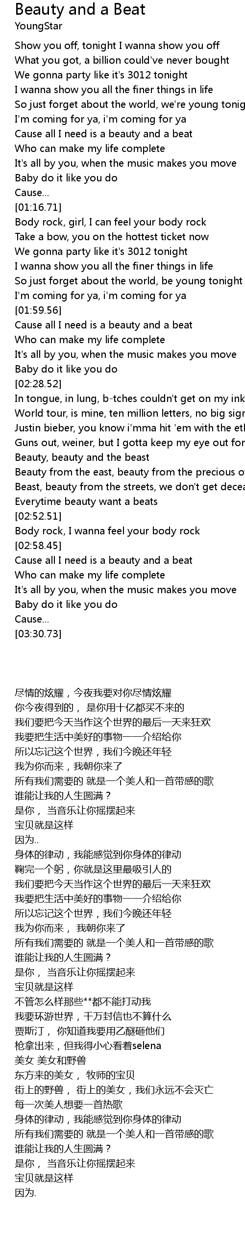 Lyrics for beauty and a beat by justin bieber feat. Music video by justin bieber performing beauty and a beat. Cause all i need is a beauty and a beat, who can make my life. Beauty and a beat lyrics. Home > justin bieber lyrics > beauty and a beat lyrics.