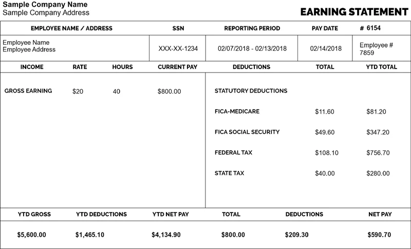 Paycheck stub employer name telephone address employee name sin address period ending earnings pay date rate hours regular gross pay .