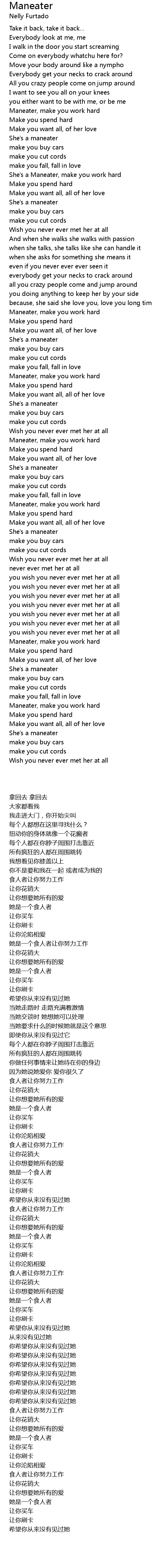 Maneater lyrics by nelly furtado from the 101 hits: maneater lyrics. You wish you never ever met her at all (come on!) you wish you never ever met her at all (what you sayin' girl?) you wish you never ever met her at all (what .